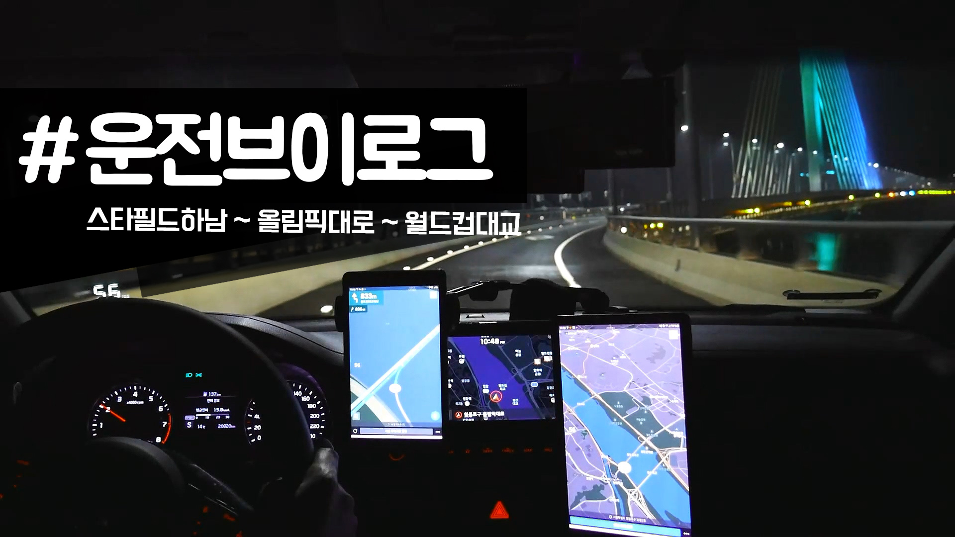 스타필드하남 지하주차장에서 올림픽대로 따라 월드컵 대교까지 야간 드라이브 영상. 태블릿용 티맵 2개 적절히 이용하기.
