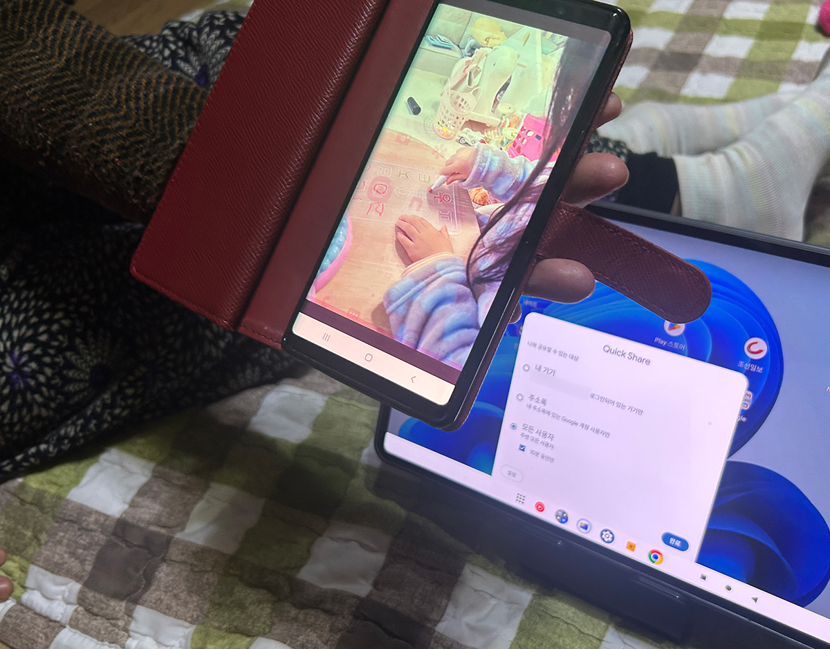 퀵쉐어가 구체적으로 뭔지는 몰라도 갤럭시폰 갤러리에 보관된 수많은 사진,영상들. 카톡으로 주고 받은 사진, 영상들을 몇 번의 클릭으로 간단히 태블릿으로 옮겨 큰 화면으로 볼 수 있으니 이것이 '와우'포인트가 된 것.