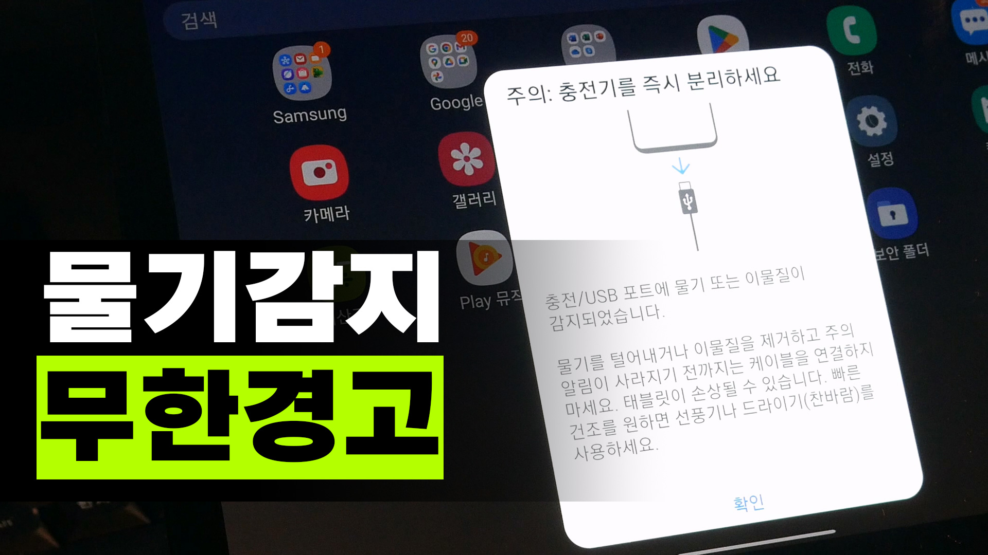 폰 태블릿에서 충전 시 물기 감지 경고가 뜨면서 충전이 안 될 수 있습니다.